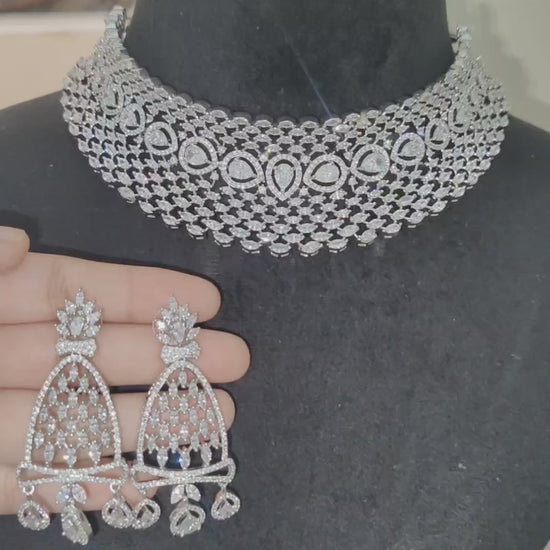 This chokar necklace and earrings set features sparkling American diamonds for a sophisticated and elegant look. With a classic design and high-quality materials, this set is perfect for any occasion and can easily elevate any outfit. Add a touch of luxury to your jewelry collection with this stunning set.