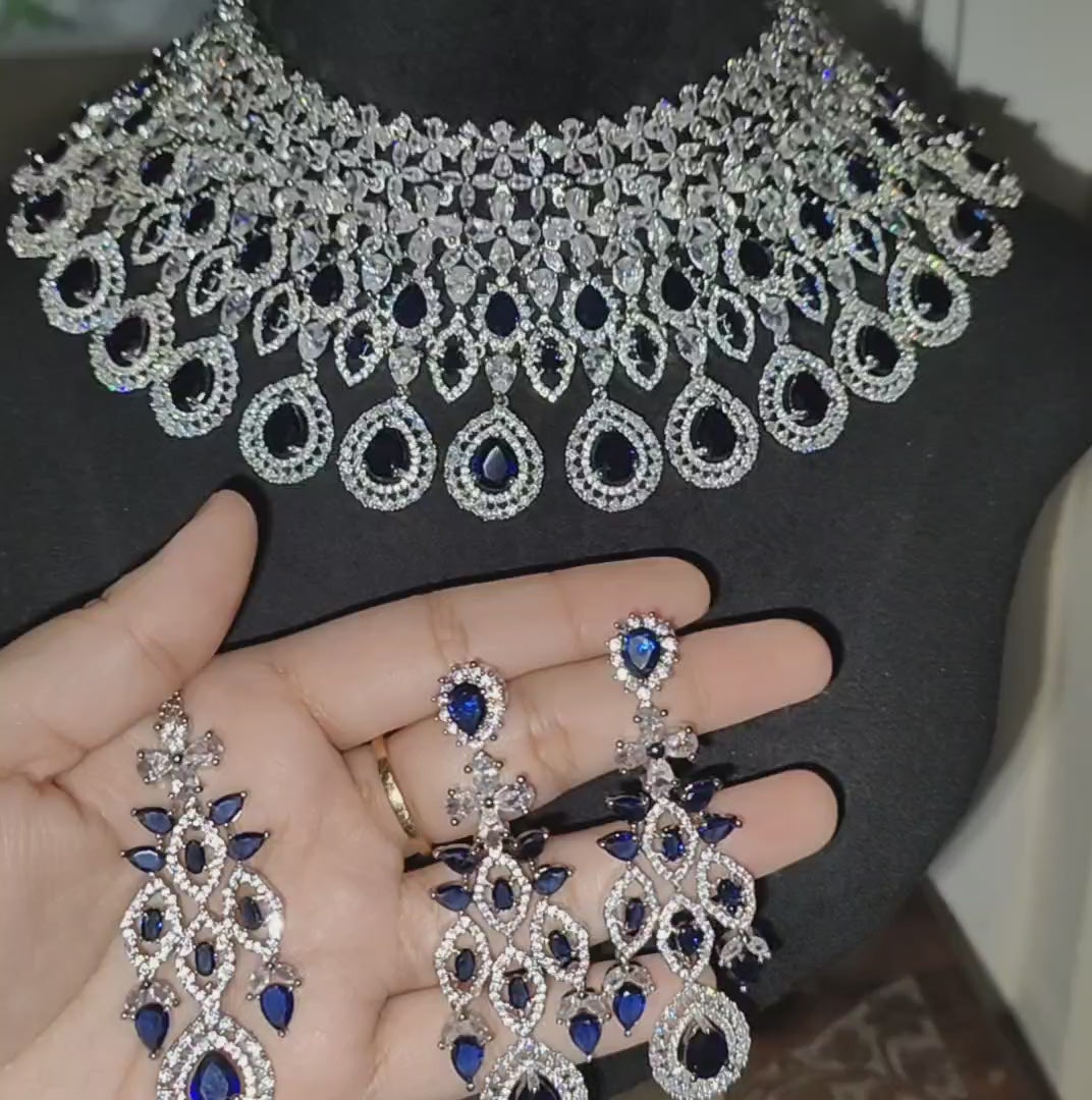 Blue American Diamond Bridal Chokar with Earrings and Maangtikka, swipe for video