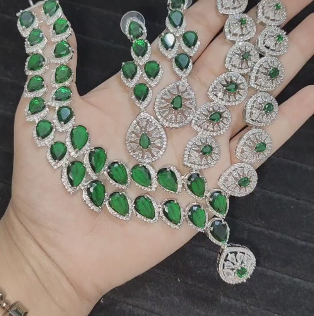 This elegant emerald green American diamond necklace adds a touch of sophistication and glamour to any outfit. Made with high-quality materials, it is the perfect accessory for any occasion. Its stunning color and timeless design make it a must-have for any jewelry collection.
