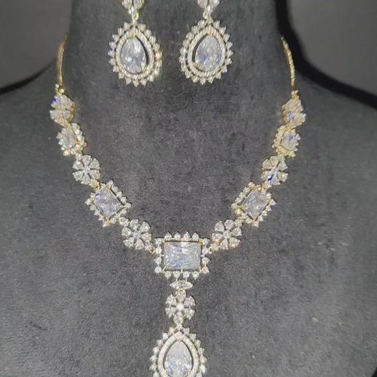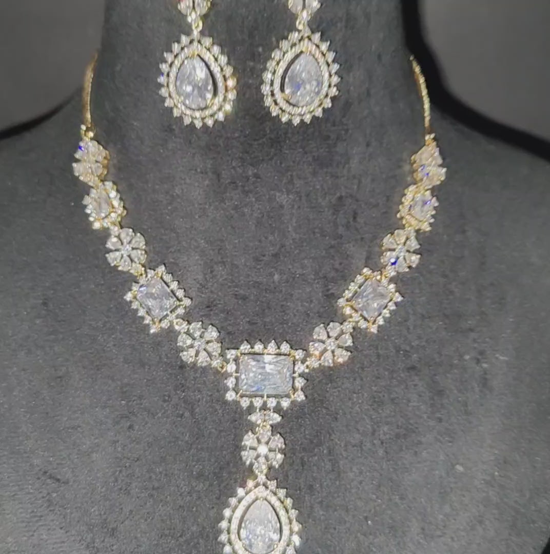 Crafted with precision, this stunning Golden Polish American Diamond Necklace and Earrings set will amp up your look instantly. The intricate design and use of high-quality materials make it perfect for any occasion. Elevate your style with this must-have jewelry set.