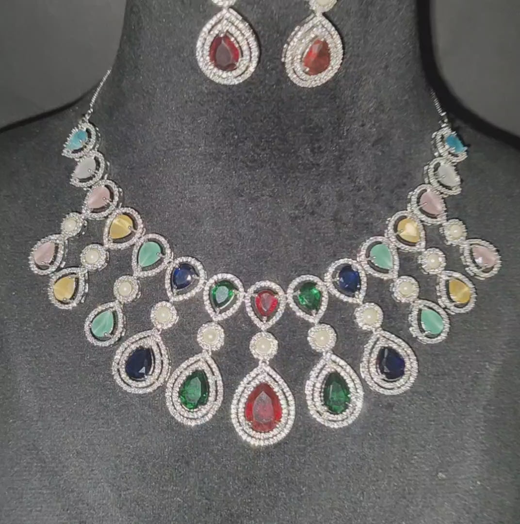 This exquisite necklace and earring set features stunning multi-colored American diamonds, adding a touch of glamour and elegance to any outfit. The high-quality materials and craftsmanship ensure lasting beauty and versatility for any occasion. Elevate your style with this must-have accessory.