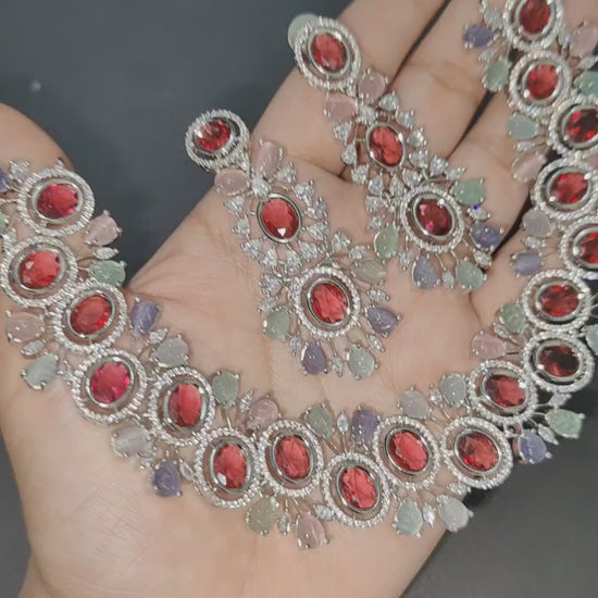 Elevate your look with our Red Multicolour American Diamond Necklace and Earrings set. Crafted with precision and detail, this stunning set features shimmering red American diamonds that will add a touch of glamour to any outfit. Be the center of attention with this elegant and unique accessory.