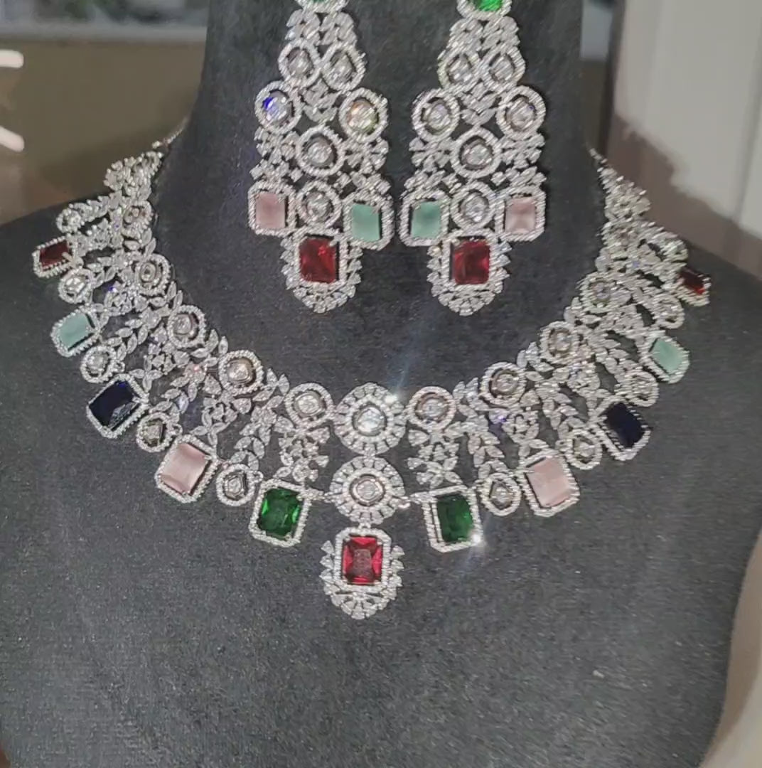 This elegant and eye-catching Multicolour American Diamond Necklace with Earrings from Ritta's Collections is a must-have addition to your jewelry collection. Made with high-quality American Diamonds, this set adds a touch of glamour and sophistication to any outfit. Perfect for special occasions or everyday wear.