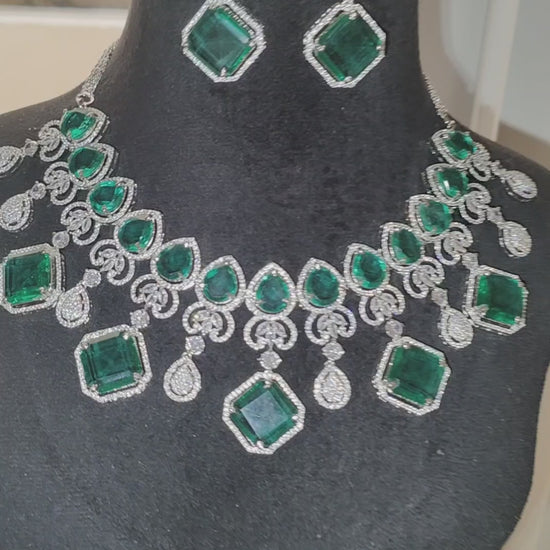 Expertly crafted with precision and beauty, the Rittas Rama necklace and earring set features elegant green American diamonds that add sophistication to any outfit. Made with high-quality materials, this necklace and earring set offers a timeless and versatile addition to your jewelry collection.
