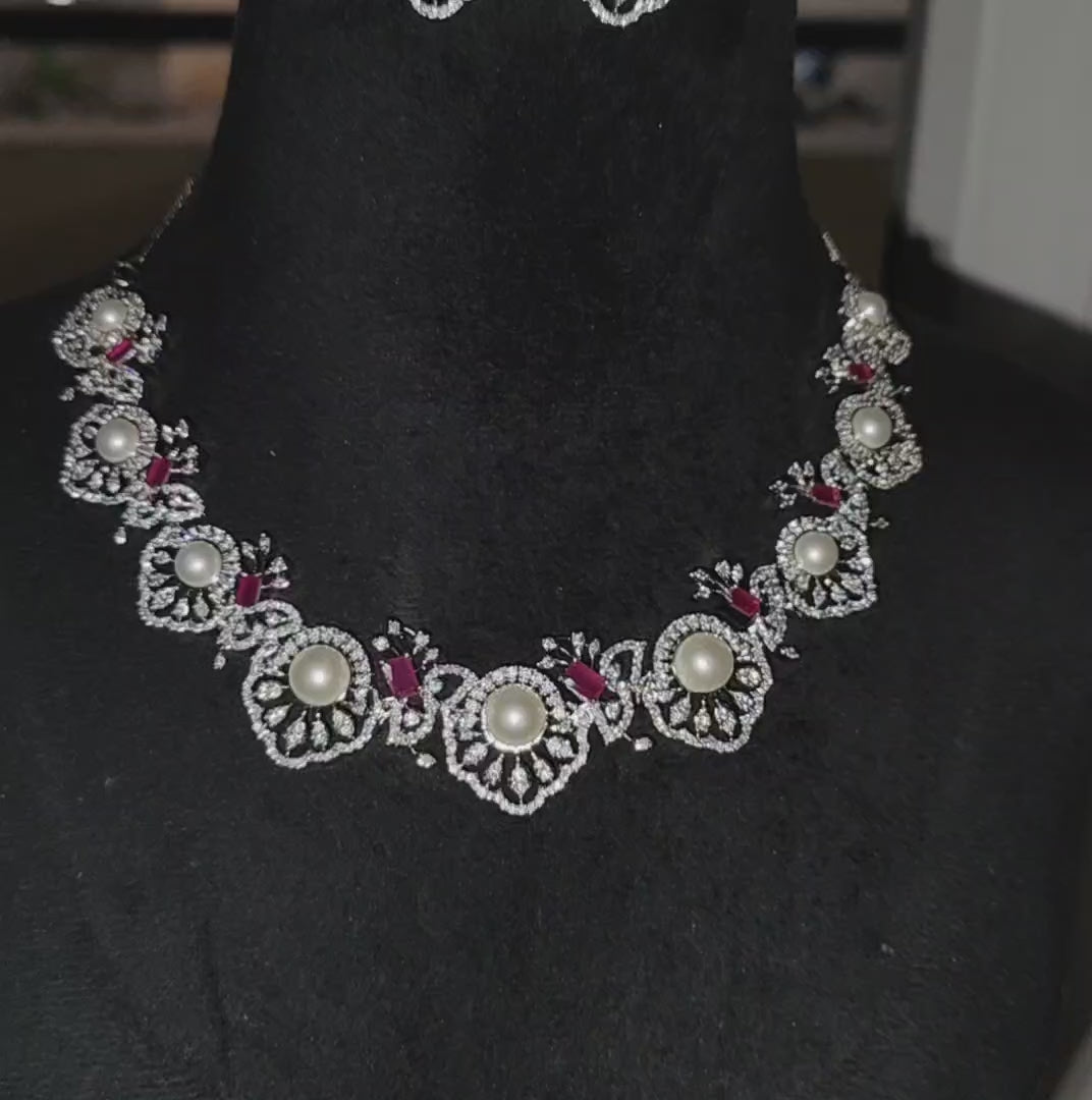 Ruby Pink Pearl American Diamond Necklace with Earrings