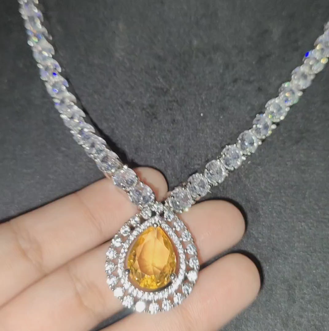 Elevate your style with this stunning Yellow American Diamond Necklace and Earrings set. Made with high-quality yellow American diamonds, this set is sure to add a touch of elegance to any outfit. Perfect for any occasion, this set is a must-have for any jewelry collection.